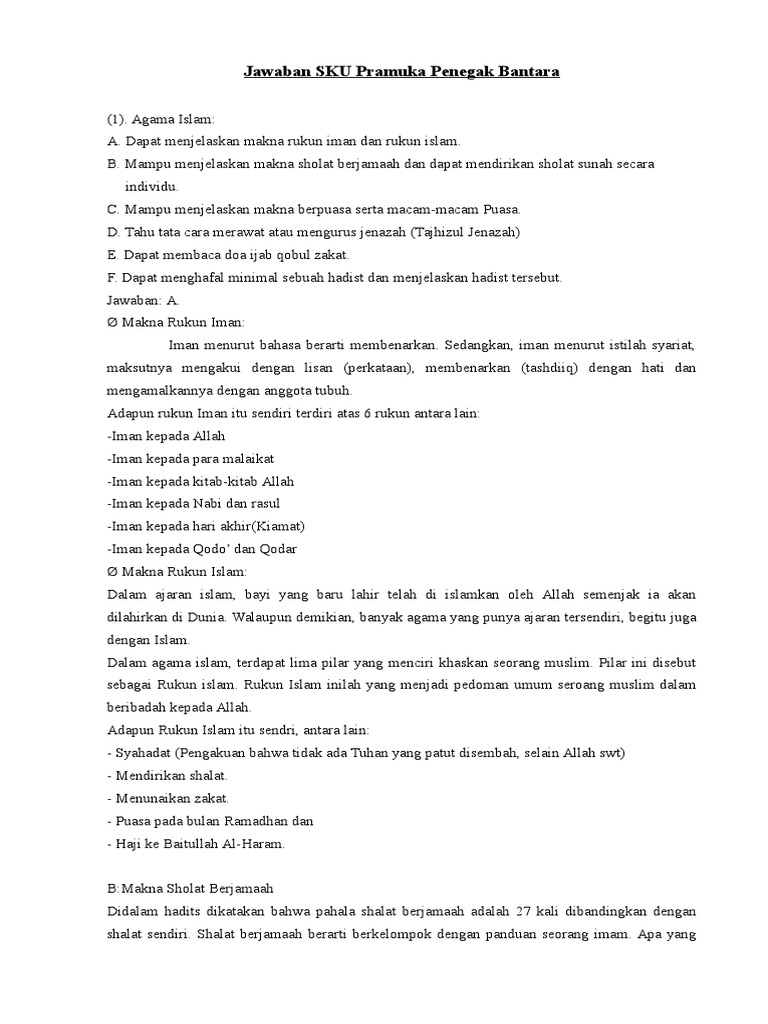 Dapat menjelaskan makna rukun iman dan rukun islam. Jawaban SKU Pramuka Penegak Bantara Selasa 21 Oktober 2014 Penegak Bantara JAWABAN SYARAT-SYARAT KECAKAPAN UMUM PENEGAK By. 12 Sejarah Kepramukaan Indonesia dan Dunia BADEN POWELL Baden Powell lahir pada tanggal 22 Februari 1857.