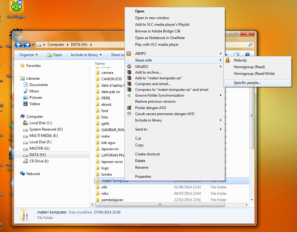 Kemudian klik kanan pada file folder tersebut. Cara Sharing Data Folder dan File di JaringanNetwork Komputer PC anda Tujuan sebenarnya dari teknik ini adalah untuk berbagi akses kepada user lain LAN pada suatu folder yang anda inginkan. Kemudian klik kanan pilih Share with Specific people.