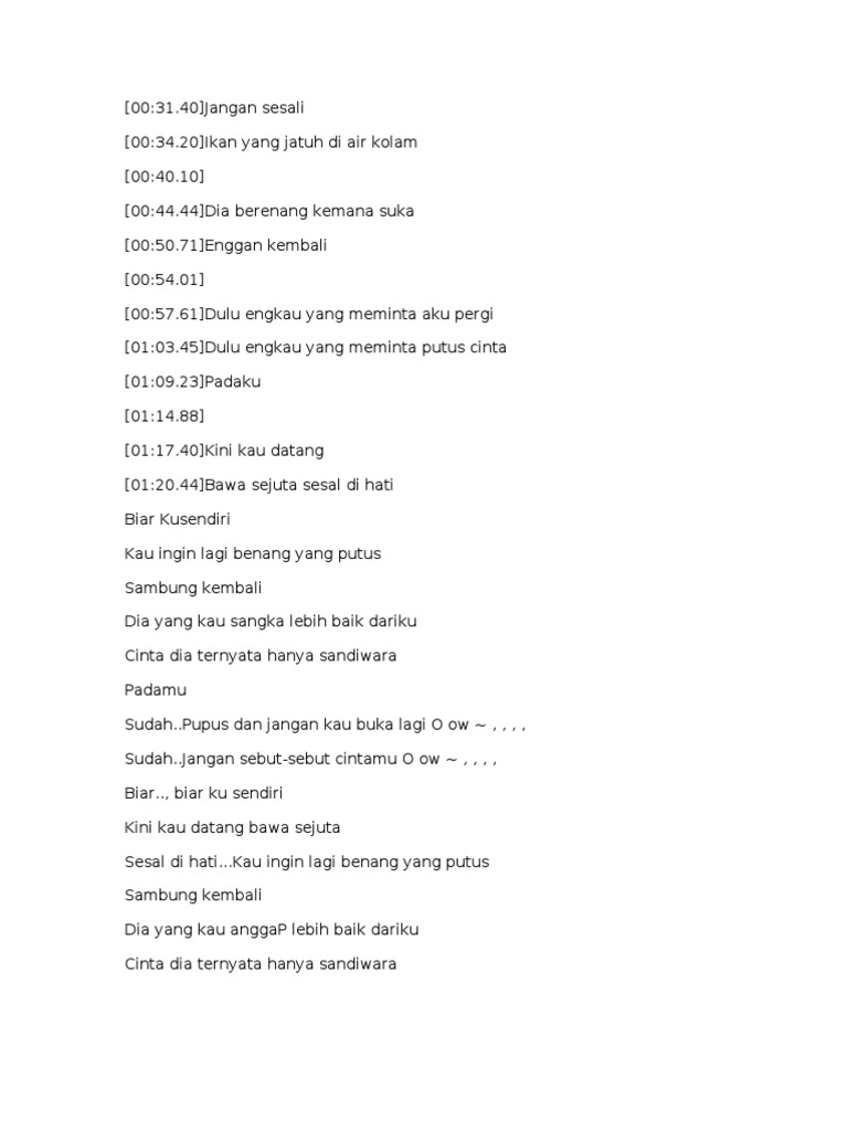 Lirik lagu Biar Ku Sendiri Penyanyi. Jangan sesali Ikan yang jatuh C di air kotor. Jangan sesali ikan yang jatuh di air kolam Dia berenang ke mana suka enggan kembali Dulu engkau yang meminta aku pergi Dulu engkau yang memminta putus cinta.