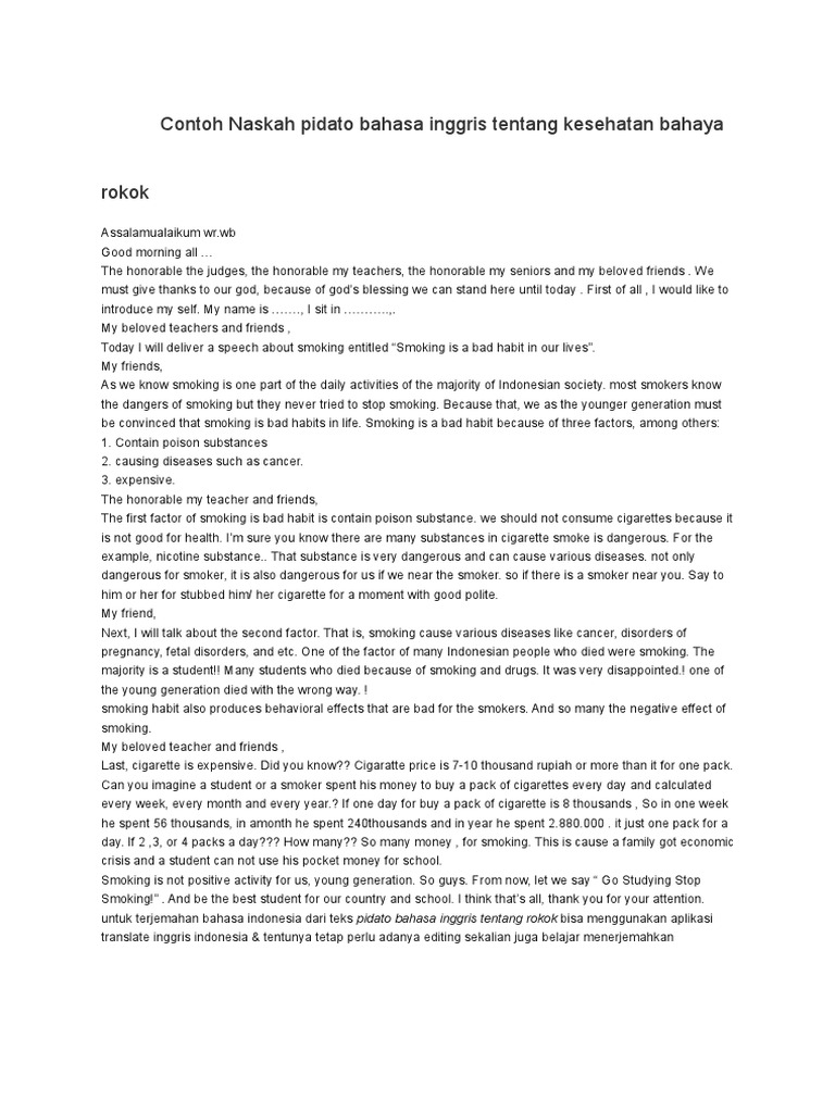 Contoh Naskah Pidato Bahasa Inggris Tentang Kesehatan Bahaya Rokok Smoking Tobacco Smoking