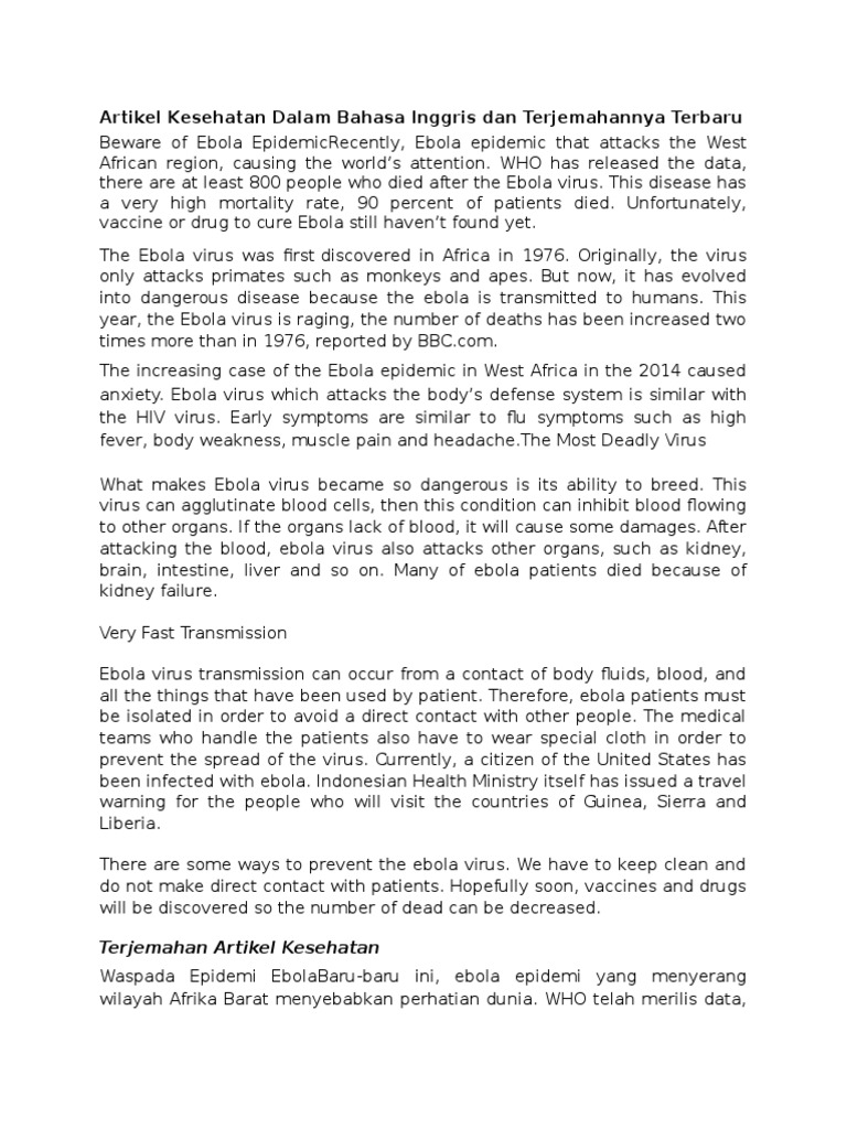 Jurnal Kesehatan Dalam Bahasa Inggris Dan Terjemahannya - Contoh Artikel Bahasa Inggris Tentang Kesehatan Beserta Artinya Berikut ini akan kami hadirkan beberapa contoh artikel tentang kesehatan dalam bahasa Inggris. At this time Public Health in Indonesia can say the condition is getting better.