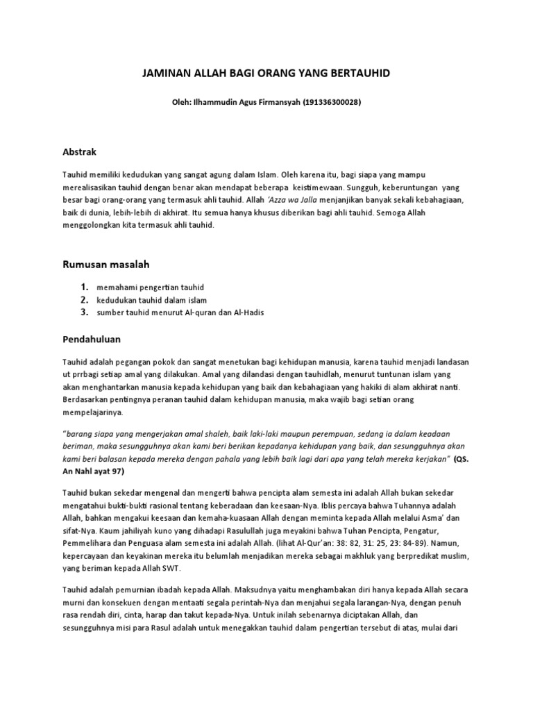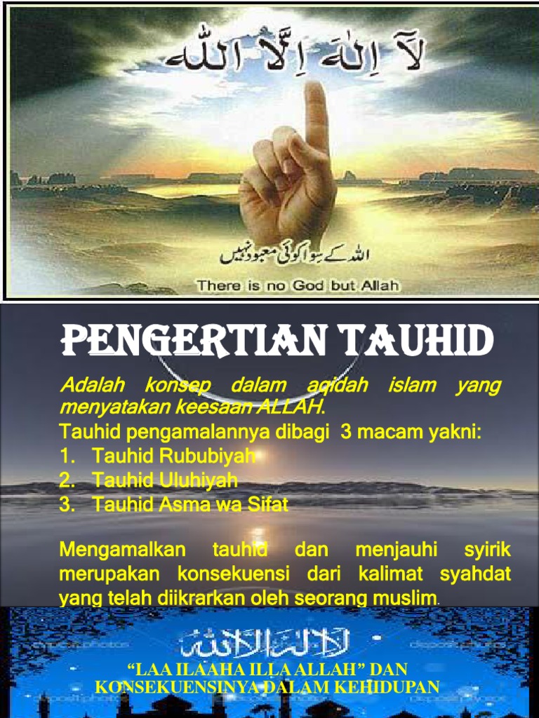 Tidak diragukan lagi bahwa tauhid memiliki kedudukan yang sangat agung dalam Islam. TUJUAN MAKALAH Menjelaskan tentang maksud Tauhid makna kalimat Laa Ilaaha ill Allah dan. Inilah Jaminan Bagi Ahli Tauhid.