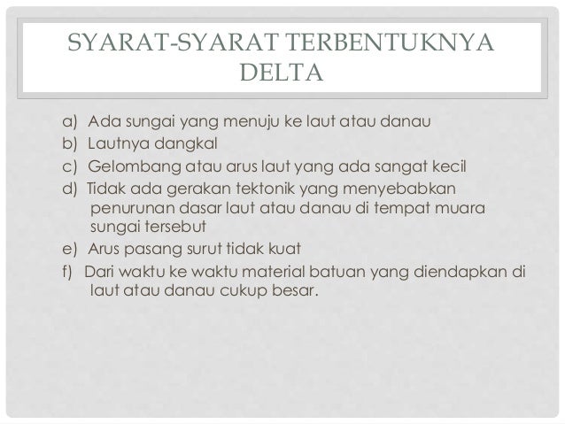 Jelaskan Syarat Syarat Pembentukan Delta - Agar memenuhi tujuan tersebut berikut beberapa syarat pembentukan paragraf. Ada sungai yang menuju ke laut atau danau.